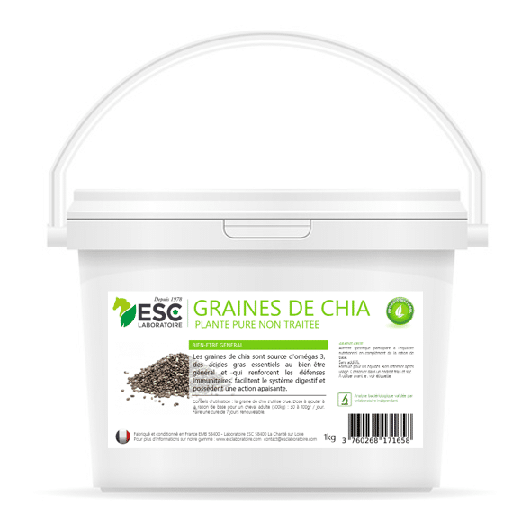 Conseils d’utilisation : la graine de chia s’utilise crue. Dose à ajouter à la ration de base pour un cheval adulte (500kg) : 30 à 100 g par jour. N’hésitez pas à demander l’avis de votre vétérinaire avant utilisation ou prolongation.