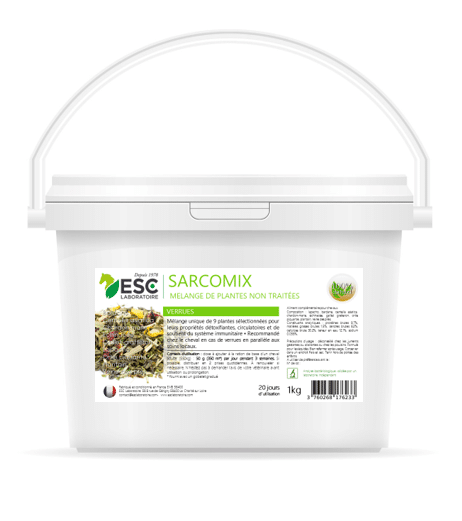 Sarcomix est un mélange de 9 plantes sélectionnées pour leurs propriétés détoxifiantes particulièrement adaptées en cas de verrues : LAPACHO – BARDANE – ORTIE – PLANTAIN – GAILLET GRATTERON – ECHINACEE – CENTELLA ASIATICA – CHARDON MARIE – REINE DES PRES.  La formule a été élaborée sous contrôle vétérinaire.